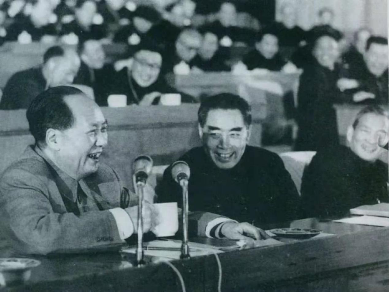 1962年初,毛泽东和周恩来、陈云在中共中央召开的扩大的中央工作会议(即七千人大会)上。
