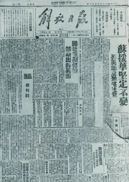 图为1941年5月16日在延安创刊的中共中央机关报《解放日报》。