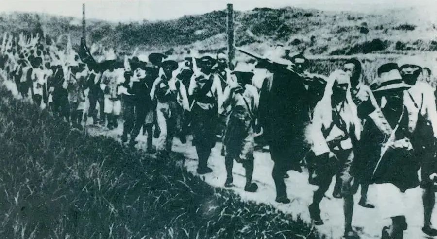1931年5月16日至31日,红一方面军在毛泽东、朱德指挥下,连续打了5个胜仗,歼敌3万余人,缴枪2万余支,打退了国民党军队的第二次“围剿”。图为行军中的红军。