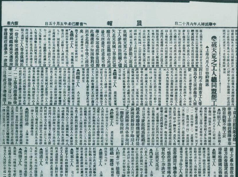 1919年6月3日以后,上海工人率先罢工,使五四爱国运动进入新的阶段。图为北京《晨报》关于上海六、七万工人总同盟罢工的报道。