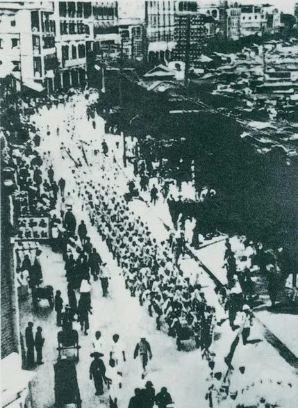 从1925年6月19日起,香港和广州租界的20万工人举行罢工,声援上海人民的反帝斗争。23日,广州和由香港回广州的工人10万余人举行大游行,在沙基惨遭英、法帝国主义的镇压。图为当时的游行队伍。