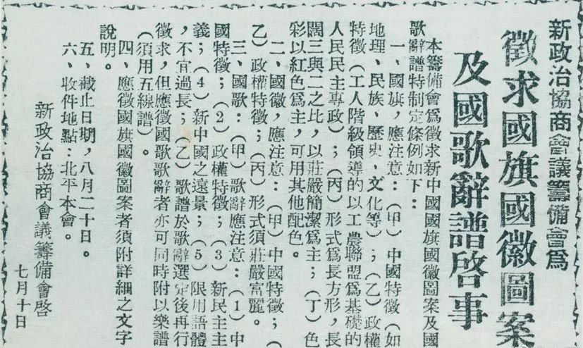 1949年7月10日,新政治协商会议筹备会决定公开向全国征集国旗、国徽图案和国歌词谱。图为《人民日报》刊登的征集启事。