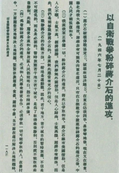 1946年7月20日,中共中央向全党发出《以自卫战争粉碎蒋介石的进攻》的指示,号召全党全军树立打败蒋介石的信心,并规定了战胜敌人的正确方针、原则和方法。图为当时的报道。