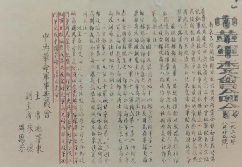 1937年8月25日,毛泽东和朱德、周恩来发出的关于红军改编为国民革命军第八路军的命令。