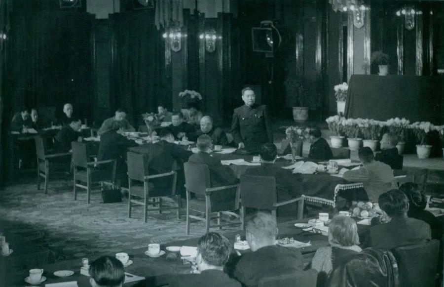 1949年10月21日,周恩来主持召开中央人民政府政务院第一次会议。正面左起:陈云、董必武、周恩来、郭沫若、黄炎培。