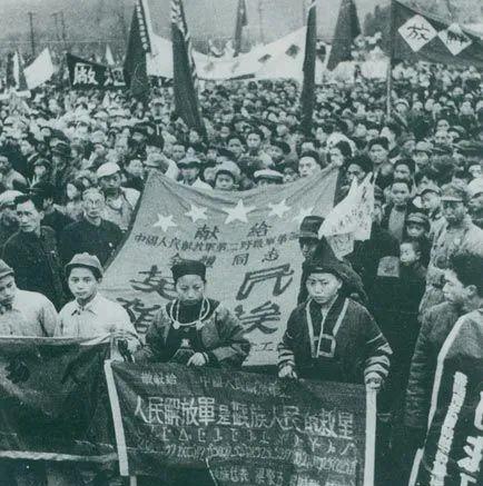 1949年11月15日,贵州解放。图为苗族同胞向人民解放军部队献旗。