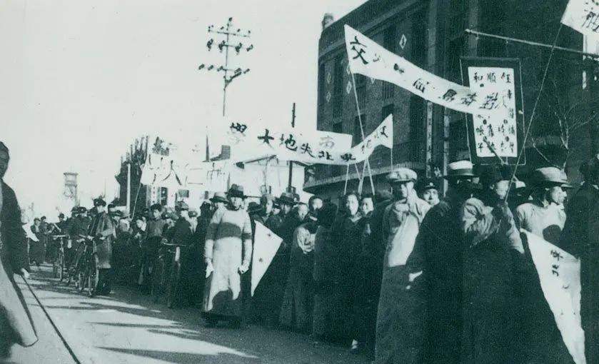 1935年12月9日,中国共产党领导北平学生掀起声势浩大的抗日救亡运动,并迅速波及全国,形成抗日救国的新高潮。图为游行队伍。