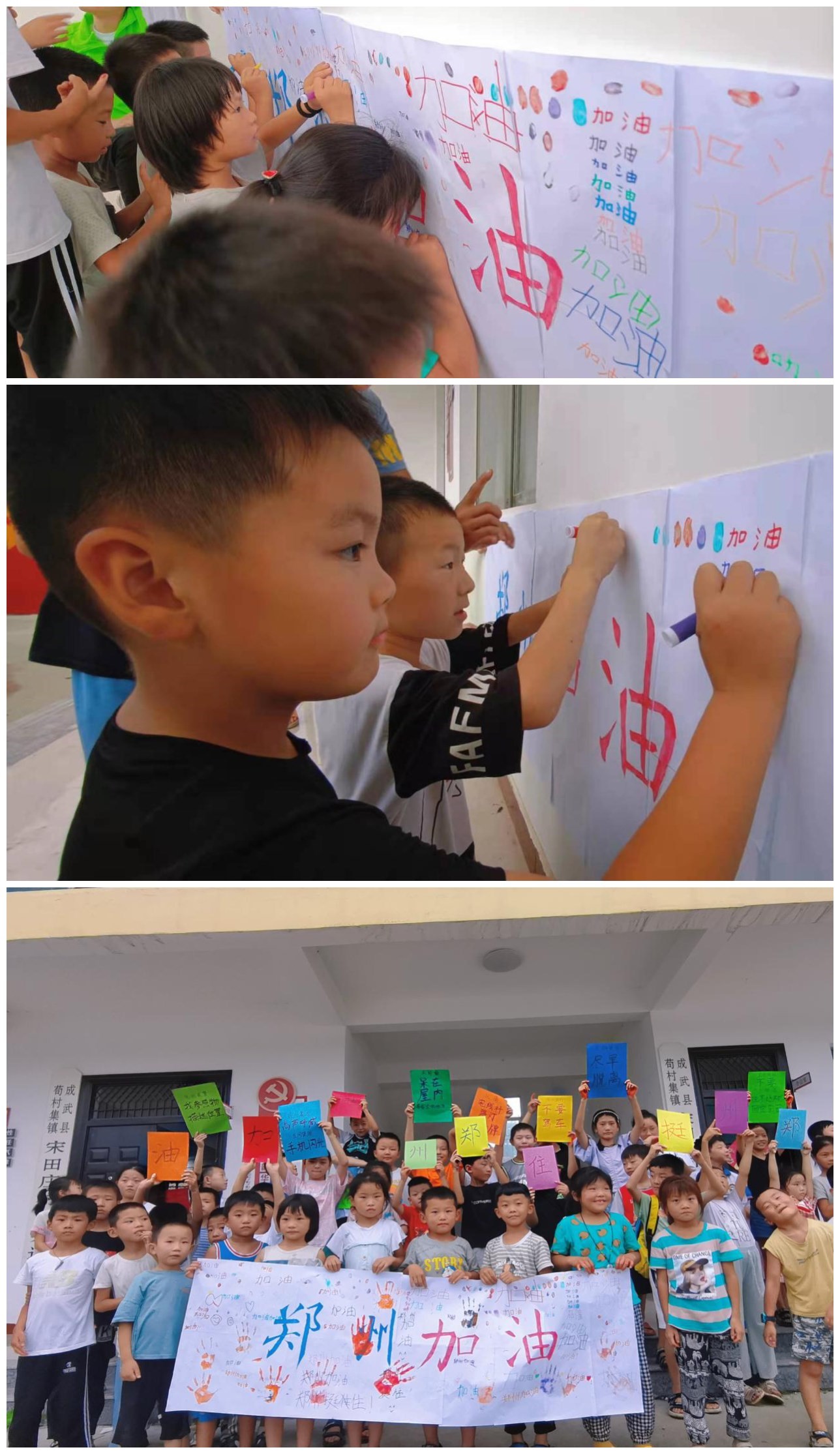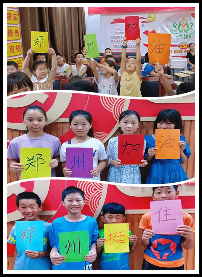 在场的孩子们都想为郑州灾情贡献出自己一份微薄的力量,大家高举着“郑州加油”、“郑州挺住”的字牌,大声的喊着:“郑州加油!郑州挺住!”稚嫩的脸上满是急切与担忧。孩子们在写着“郑州加油”的横幅上按上自己的手印,自发的画了爱心来表达他们对于国家的热爱,并在画里写上“加油”等为郑州鼓励的话语,来表达自己对郑州顺利渡过难关的祝愿和期望。