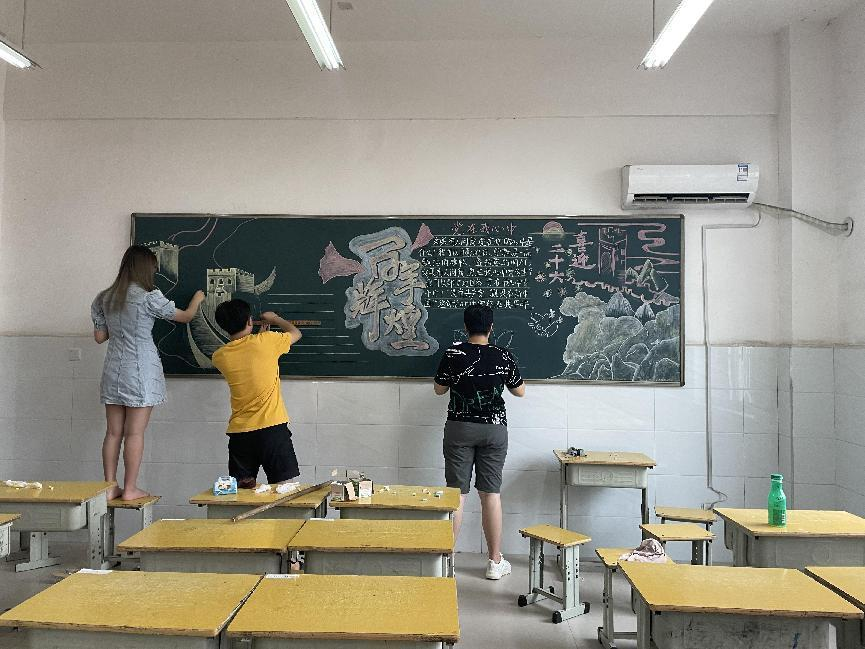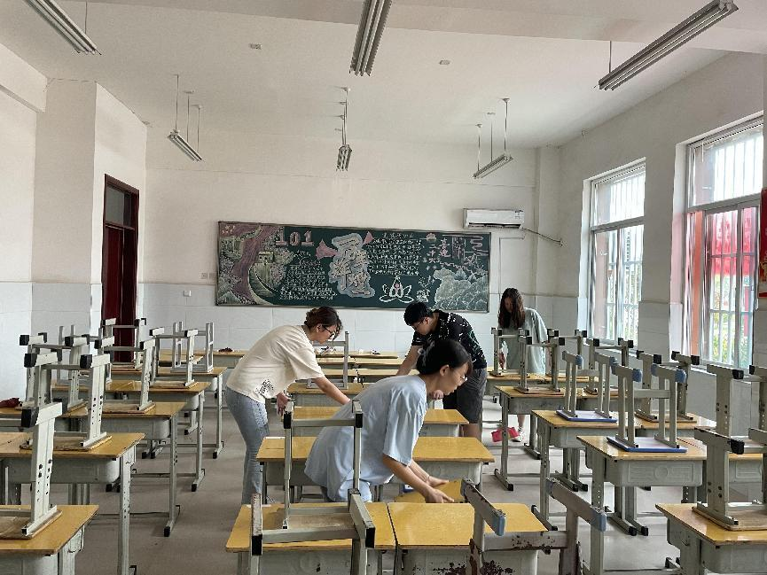 志愿者们对教室里的桌椅板凳、门窗以及讲台等进行打扫,为孩子们今后的学习打造一个舒适整洁的环境,并悉心准备了开营仪式的主题班会和黑板报。