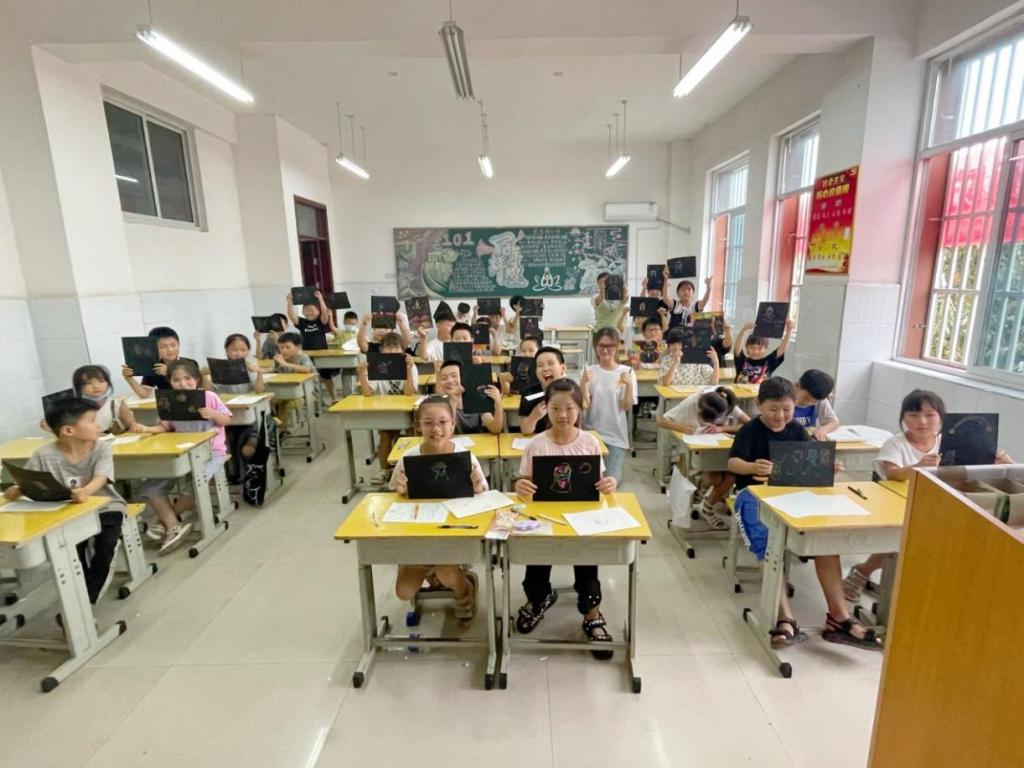 课程采用了新颖独特的绘画工具——刮画纸,颠覆了以往的绘画方式,利用其竹笔在纸上刮出彩色线条的独特效果;孩子们在课堂上认真听讲并积极动手,在炙热的天气里找到了内心的一份宁静。