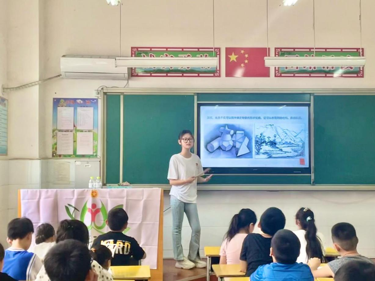 课程以“创意美术,趣味无限”为主题,志愿者们结合事物实例,如长城蜿蜒盘旋的曲线,又如刚劲挺拔竹林的直线,尽述线条之美,加深孩子们对不同种类线条传达给人不同情感的理解。