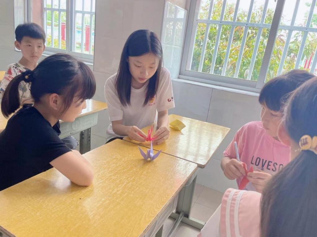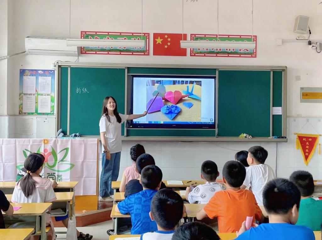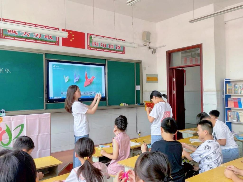 志愿者们选择了两个非常受孩子们喜欢的折纸方式——千纸鹤和爱心。志愿者们先带孩子们观看教学视频,让孩子们学习制作自己喜欢的作品。