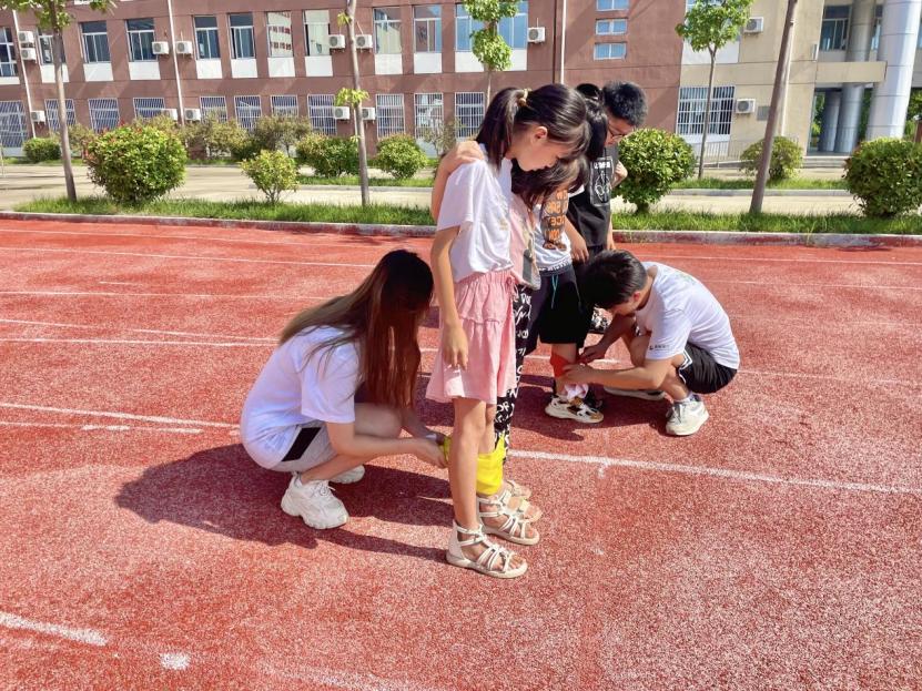 (志愿者们在为孩子们做赛前准备)