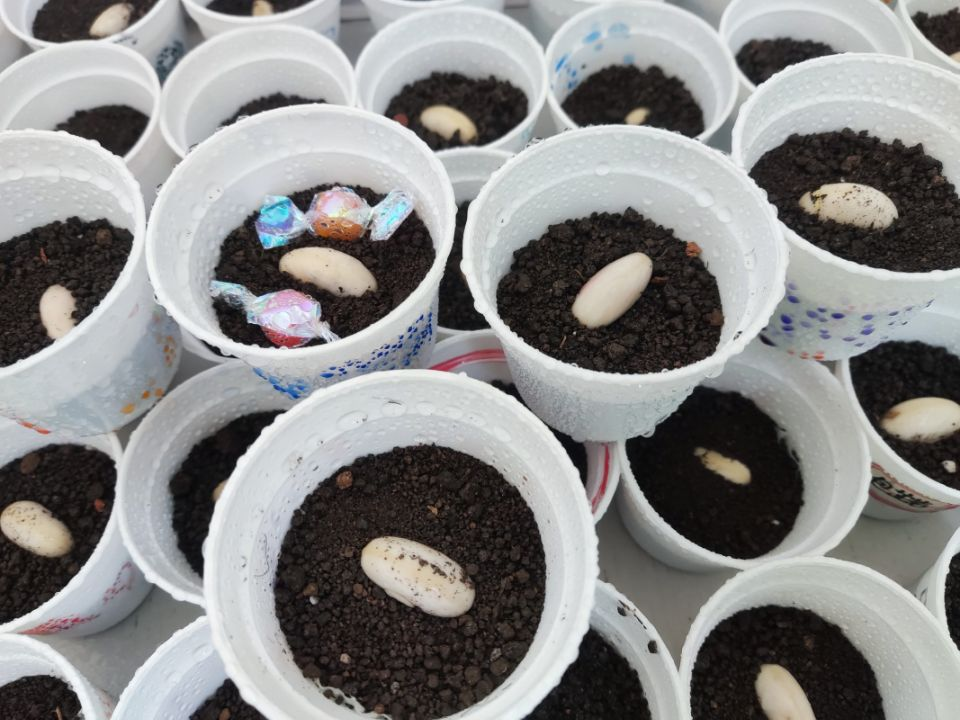 当孩子们拿到种子时,眼睛里都闪着兴奋的光芒,迫不及待地想要自己的种子立刻发芽。他们小心翼翼地将种子埋进土里,像埋下小小希望,其中一个孩子说:“希望自己像种子一样,健康成长,步步登高!”