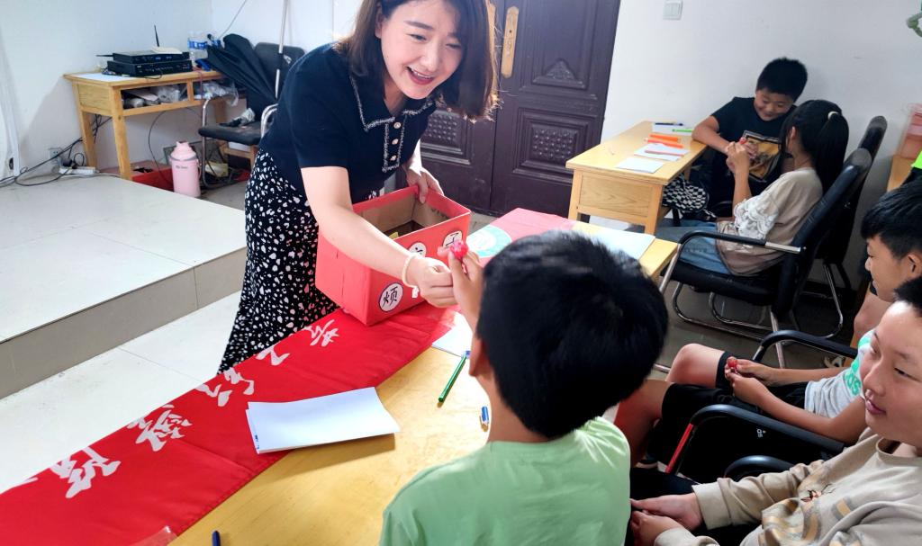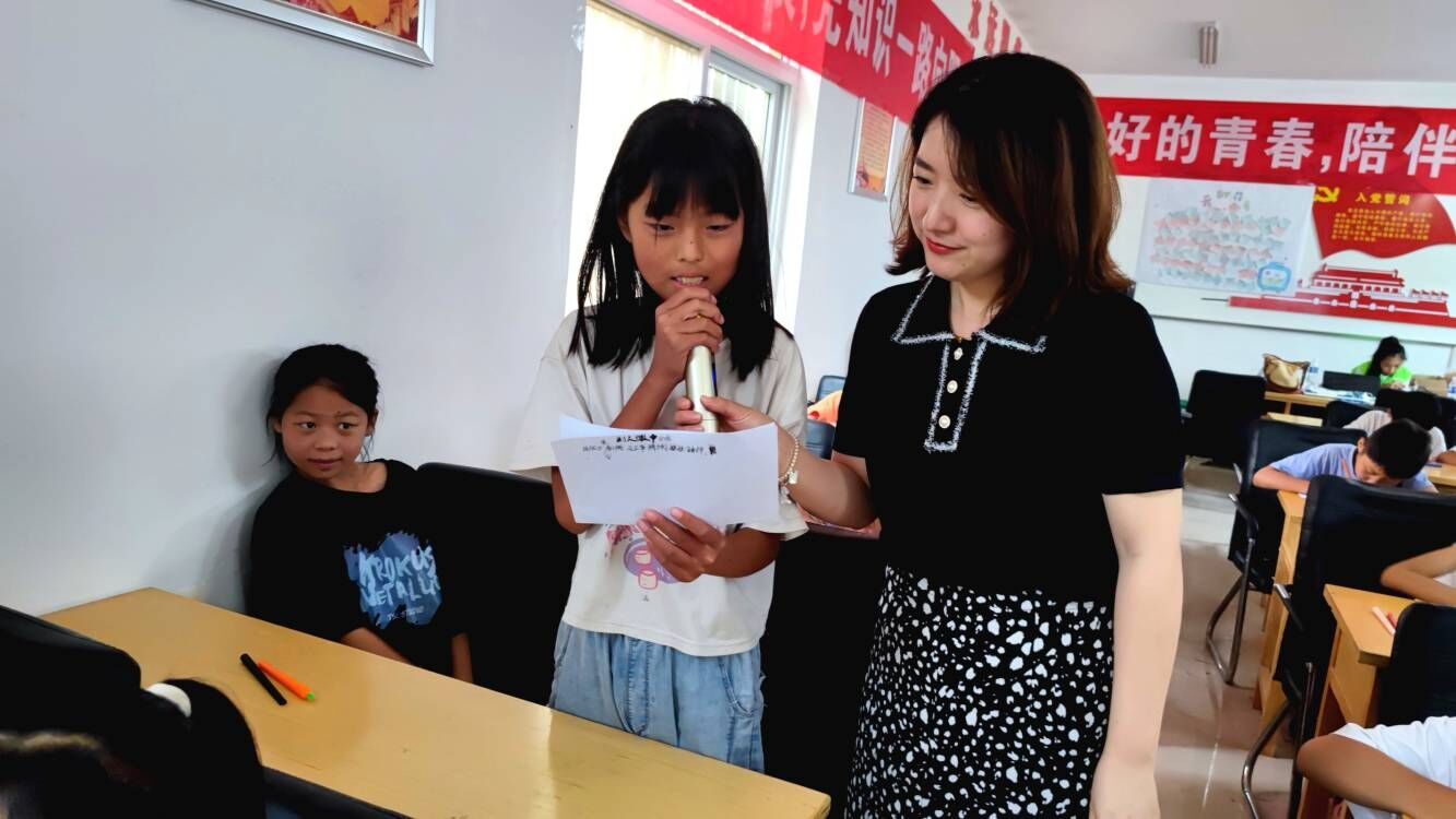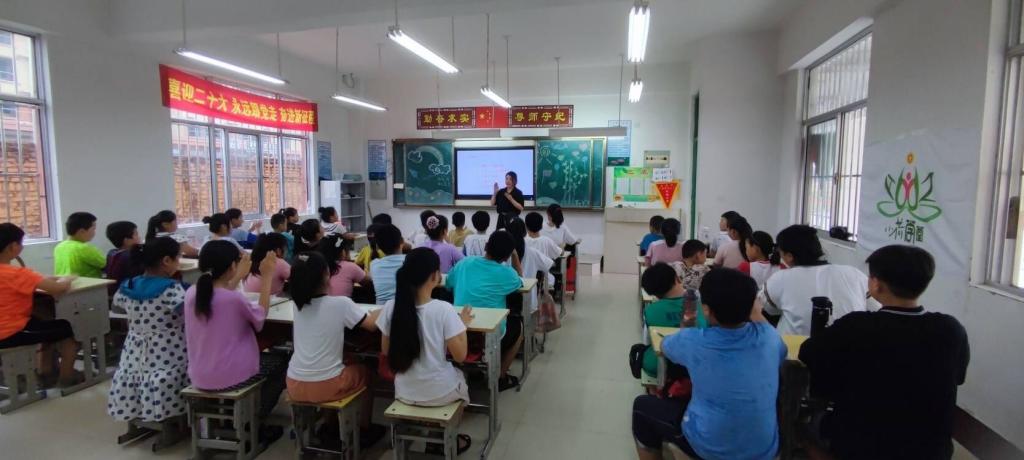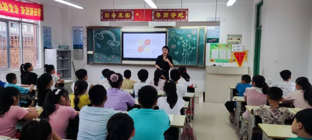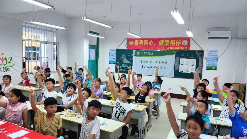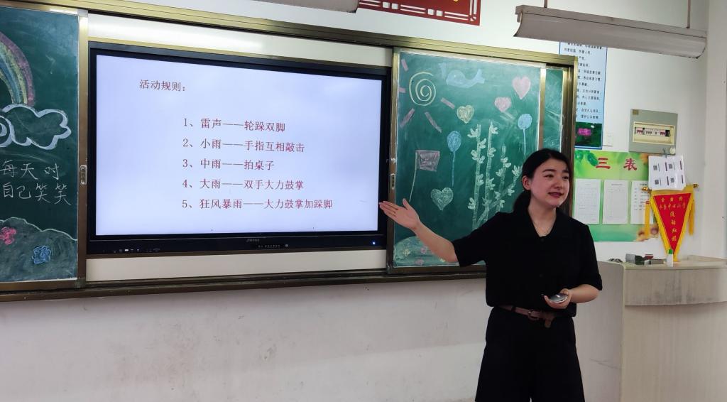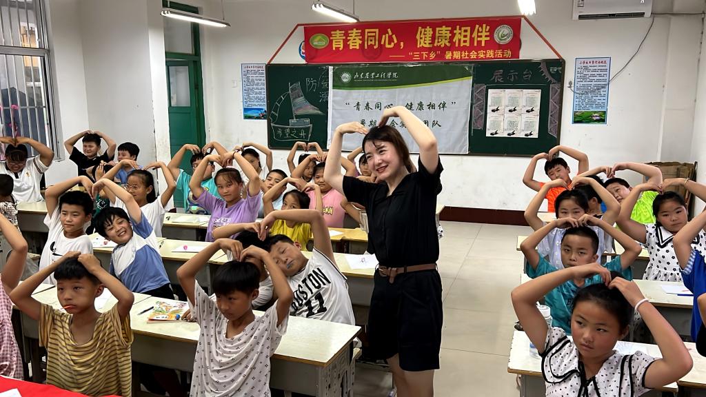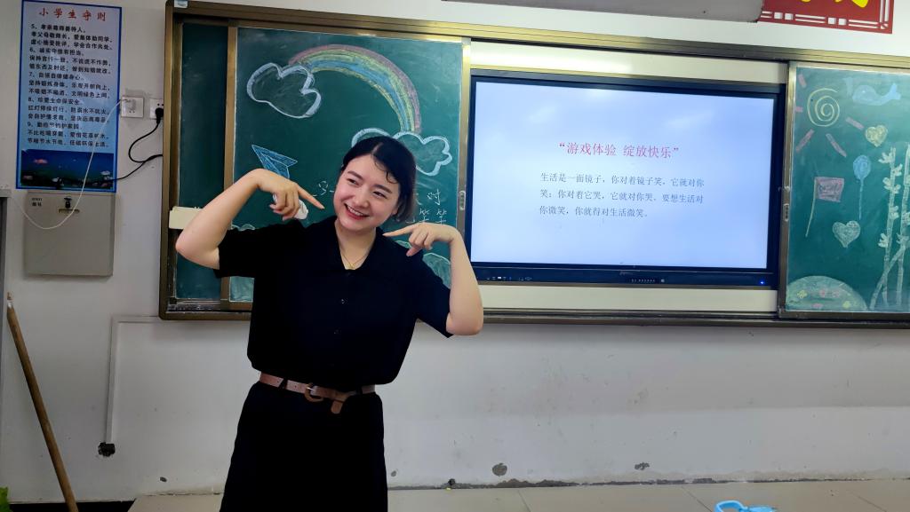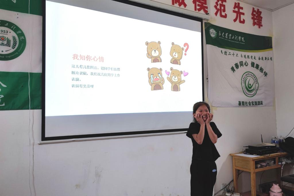 团队指导教师张娟给当地儿童带来一堂主题为“呵护心灵,健康成长”的心理健康课程,通过知识讲解、现场模拟、案例分析、游戏互动等形式普及青少年心理健康知识。