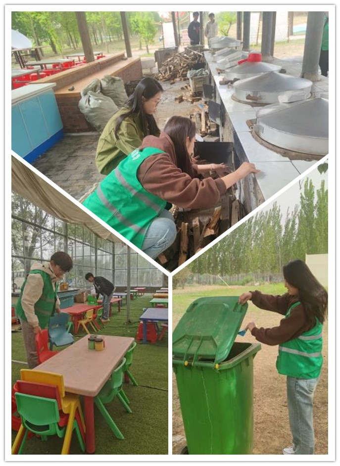队员们除了查看设备投入使用情况,还顺带着把农场周边的垃圾清理干净,营造更加卫生、整洁的环境。队员们热心帮忙生火,让客人们可以更快地品尝到当地的特色菜,认真检查桌椅和工具是否安全,让孩子们可以在一个安全的环境下游戏。