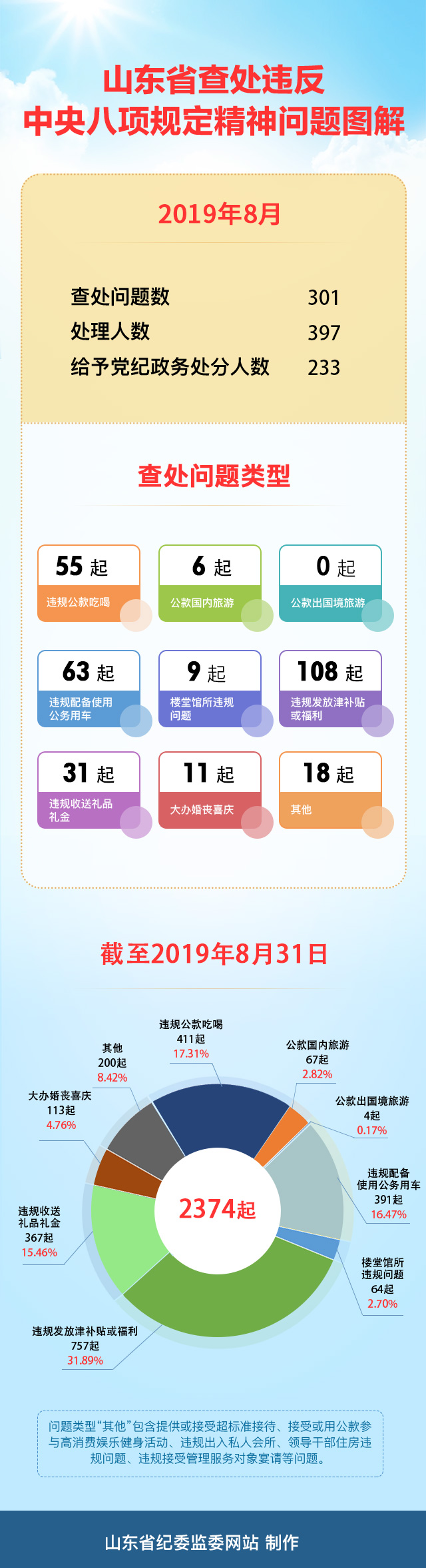 2019年8月,山东省各级纪检监察机关查处违反中央八项规定精神问题301起,处理397人,给予党纪政务处分233人。