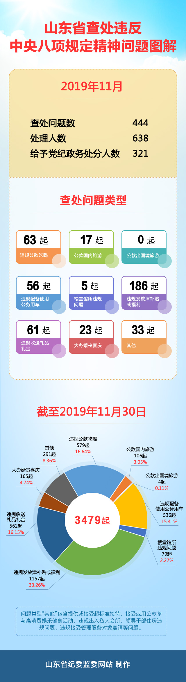 2019年11月,山东省各级纪检监察机关查处违反中央八项规定精神问题444起,处理638人,给予党纪政务处分321人。