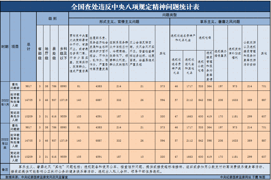 2月25日,中央纪委国家监委公布了2022年1月全国查处违反中央八项规定精神问题汇总情况。当月,全国共查处违反中央八项规定精神问题9817起,批评教育帮助和处理14705人,其中党纪政务处分10209人。这是中央纪委国家监委连续第101个月公布月报数据。