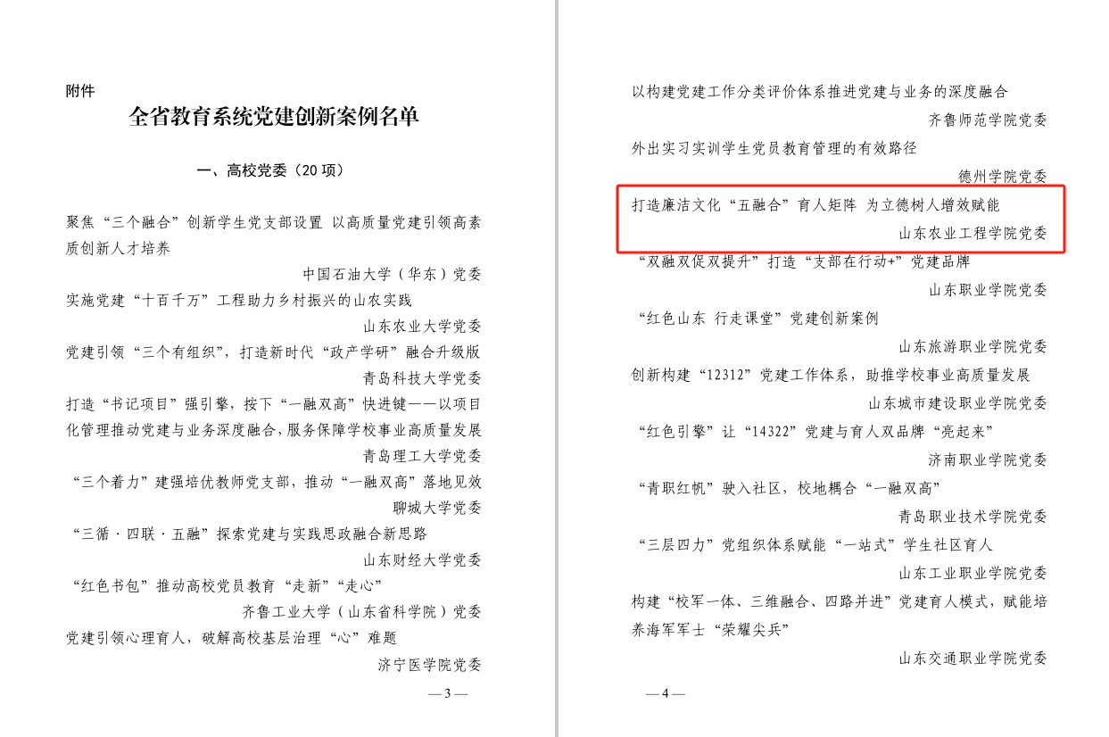 近日,山东省委教育工委公布了全省教育系统党建创新案例名单,今年会申报的《打造廉洁文化“五融合”育人矩阵 为立德树人增效赋能》案例,因鲜明特色、可复制机制和可推广经验获评“高校党委”系列党建创新案例之一(共20项)。