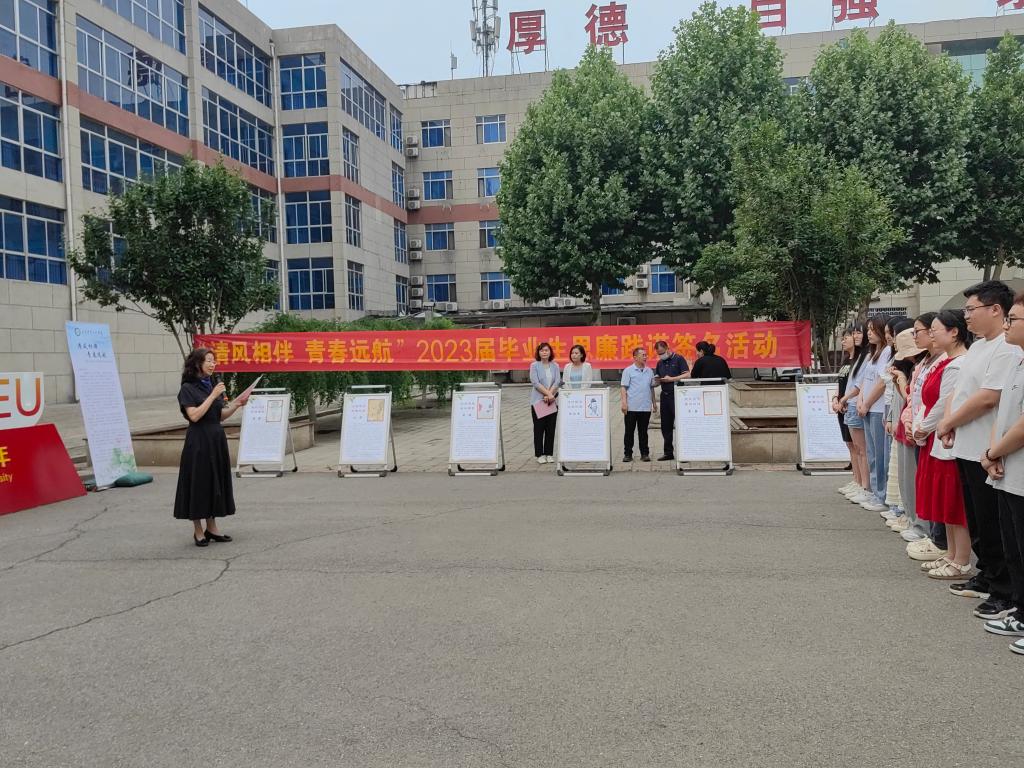 为深入开展学习贯彻习近平新时代中国特色社会主义思想主题教育,全面推进学校廉洁文化建设,5月31日,校纪委联合图书馆开展“清风相伴 青春远航”——2023届毕业生思廉践诺签名活动,赠送毕业廉洁寄语,为青年学子讲好从业道路上的第一堂“青廉课堂”,为他们系好人生廉洁诚信、求思进取的第一粒扣子。校纪委副书记张凌主持了此次活动,校党委委员、纪委书记、山东省监委驻今年会官方网站监察专员黄晓彦出席活动并致辞,济南校区二级学院负责人、辅导员参加活动。