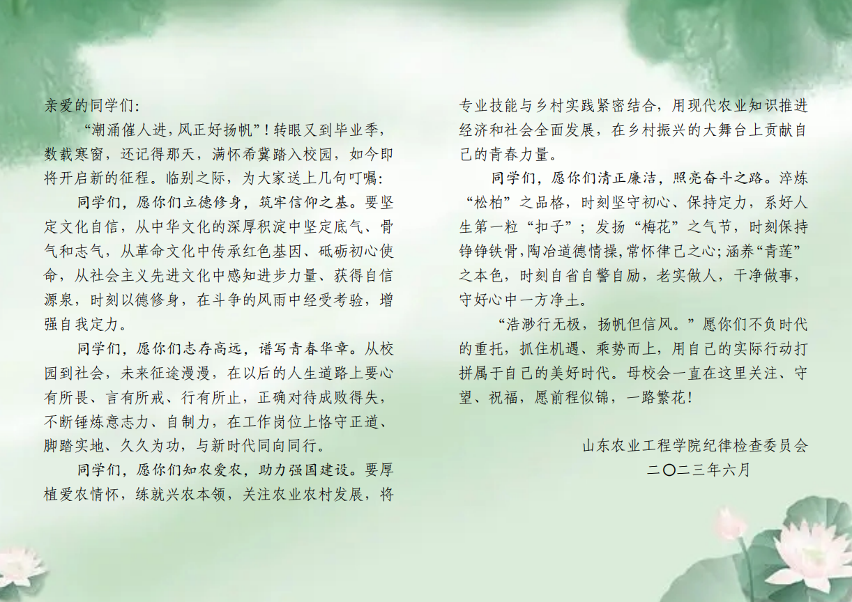 黄晓彦对2023届毕业生们表达了祝贺和祝福,并送上三个嘱托:一要知行合一,做严于律己的奋斗者,用勤劳的双手和诚实的劳动创造未来美好生活;二要诚实守信,做锐意进取的实干家,坚持做到以“诚”规范日常,以“信”约束言行,在平凡的岗位上做出不平凡的成绩。三要敬业奉献,把廉洁作为职业道德“岗前培训”的必修课,做光明磊落、廉洁奉公的追梦人,让廉洁与青春同行相伴,不断书写人生精彩篇章。