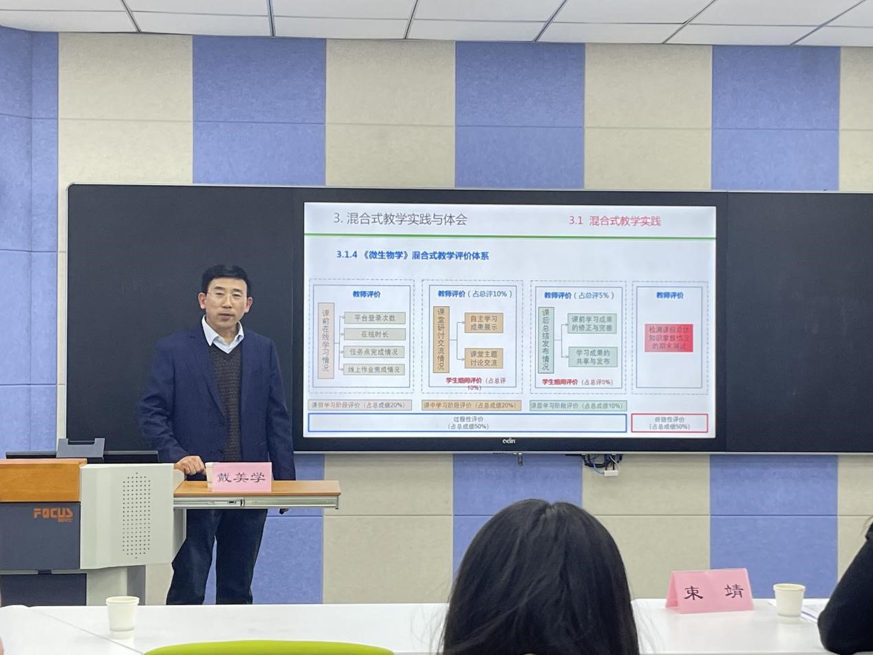 讲座伊始,戴教授讲解了一流课程建设的背景,以国家级线上线下混合式一流课程《微生物学》为例,对一流课程的培育、建设、申报等做了详细解读。课程建设过程中,借助超星学习通平台,以构建课程知识体系为基础、以培养学生高阶思维能力为目标、以基于问题的学习为综合能力提升的途径、以多元质量评价体系为评价依据,从课前、课中、课后进行科学、周密的教学设计(线上线下一体化设计),并将教学资源与教学设计相配套、相适应,提升混合式教学效果。