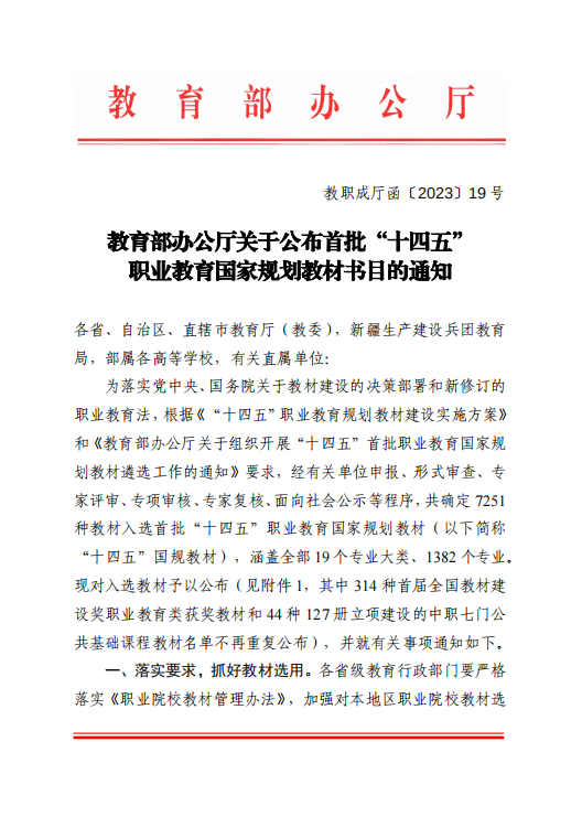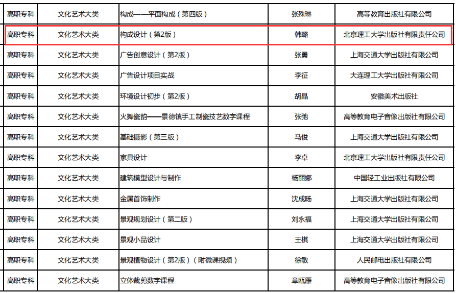 2023年6月19日,教育部公布了首批“十四五”职业教育国家规划教材名单,经单位申报、形式审查、专家评审、专项审核、专家复核、面向社会公示等程序,今年会艺术学院韩璐主编的《构成设计》继入选“十三五”职业教育国家规划教材后,再次入选首批“十四五”职业教育国家规划教材。