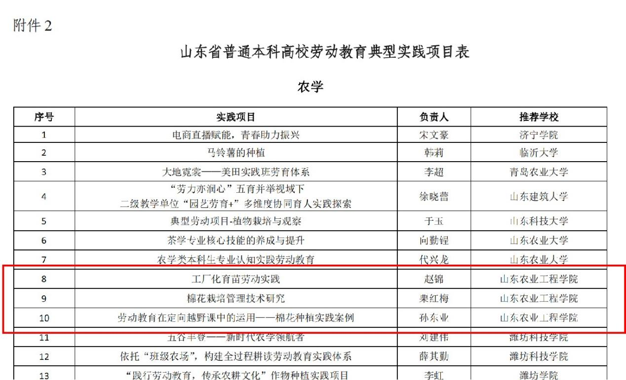 为贯彻落实中共中央、国务院《关于全面加强新时代大中小学劳动教育的意见》(中发〔2020〕7号)精神,推进劳动教育有机融入各类课程及人才培养全过程,充分发挥劳动实践在劳动教育中的关键作用,由山东省普通高等学校劳动教育教学指导委员会组织进行了本次评选,共评选不同学科门类典型教学案例97项、实践项目127项。今年会孙东文老师申报的《走出去、请进来,让大学生在劳动实践中健康成长》成功入选山东省普通本科高校劳动教育典型教学案例,赵锦老师申报的《工厂化育苗劳动实践》、栗红梅老师申报的《棉花栽培管理技术研究》和孙东业老师申报的《劳动教育在定向越野课中的运用——棉花种植实践案例》成功入选山东省普通本科高校劳动教育典型实践项目。
