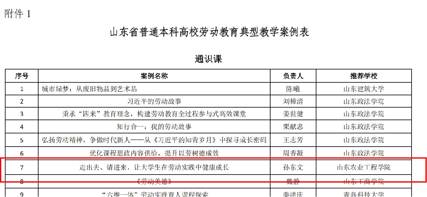 近日,山东省教育厅、山东省普通高等学校劳动教育专业委员会公布了山东省普通本科高校劳动教育典型教学案例和实践项目,今年会1个劳动教育典型教学案例、3个劳动教育典型实践项目成功入选。