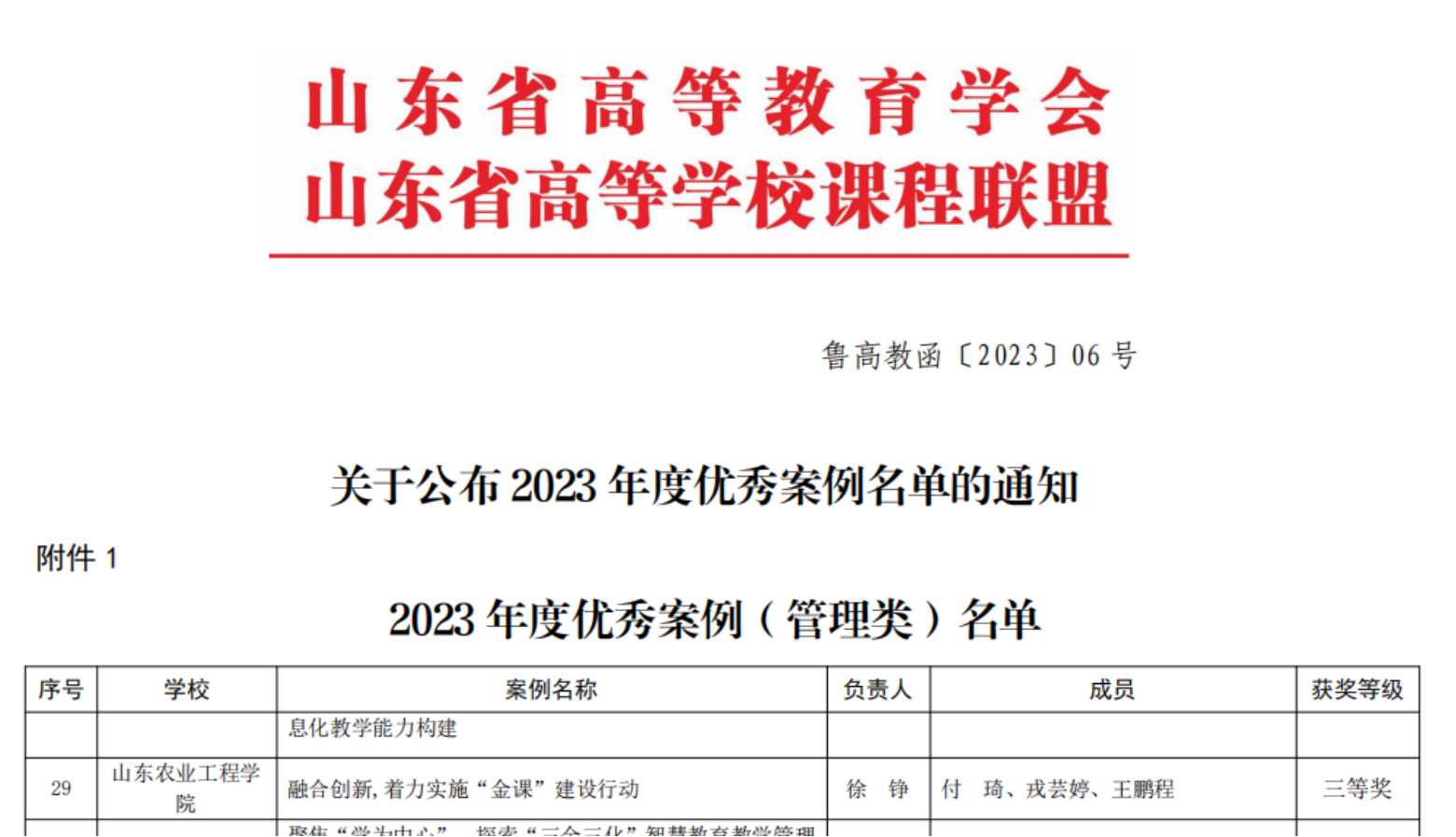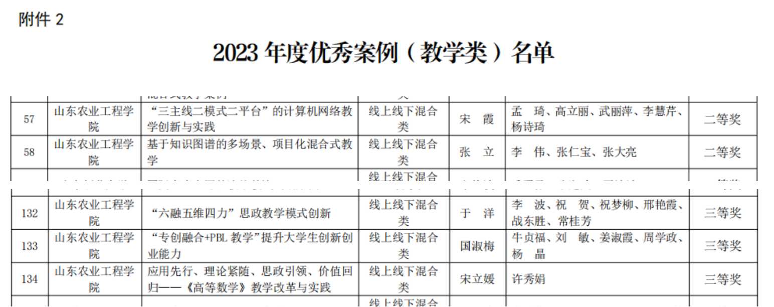 近日,由山东省教育厅高等教育处指导,山东省高等教育学会和山东省高等学校课程联盟联合组织的优秀案例评选结果公布。今年会申报的6项案例获奖,其中,获得教学类二等奖2项、三等奖3项,管理类三等奖1项。