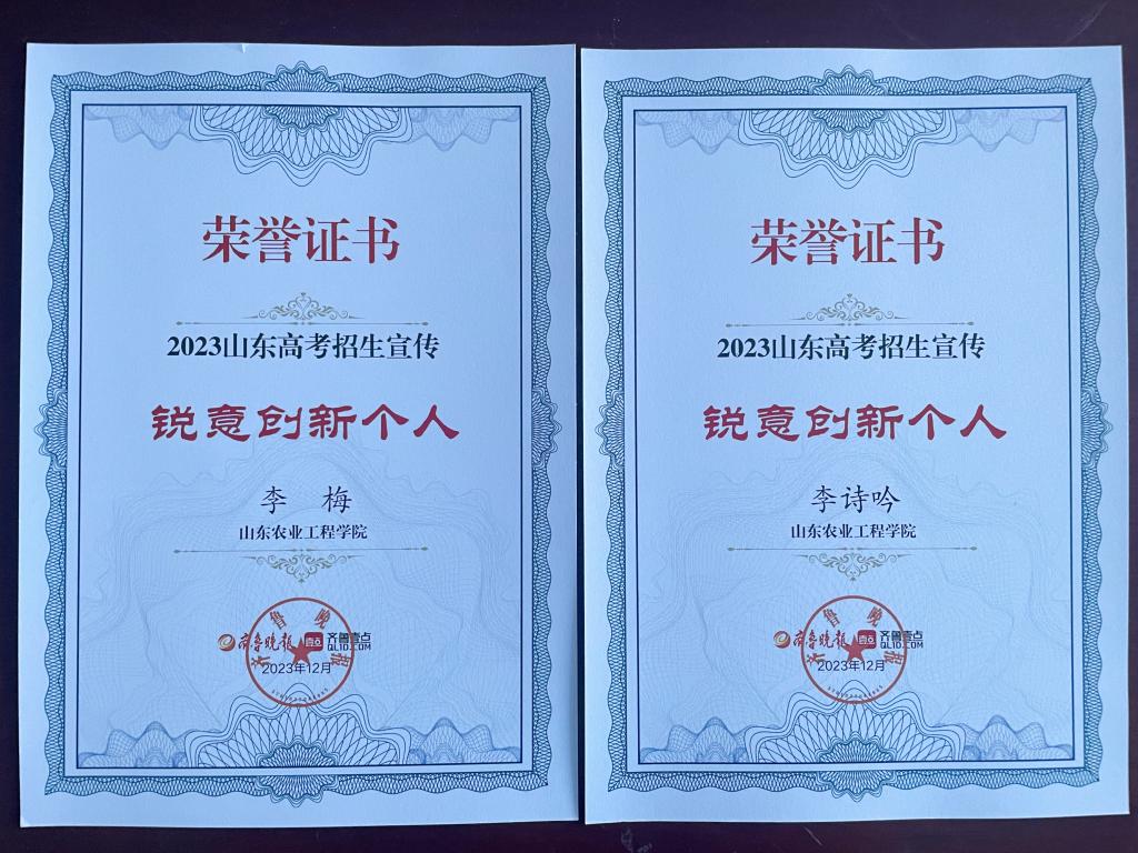 近日,齐鲁晚报·齐鲁壹点、新浪、中国教育在线等媒体发布2023年度招生工作荣誉榜单,今年会荣获“2023年度山东高招会最具人气高校”“2023年度招生宣传品质传播高校”“2023年度招生宣传网络影响力奖”“2023年度高招宣传创新本科高校”等多项荣誉。教务处2人获“2023山东高考招生宣传锐意创新个人”“2023年度新浪网山东站招生宣传先进标兵”称号。