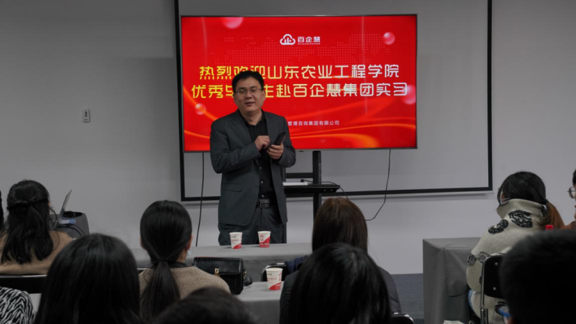 百企慧企业咨询管理集团董事长单宝强、人力资源部部长侯现燕热情接待了商学院的老师和同学们。此次实习的总负责人赵瑞婧带领同学们参观了百企慧集团的办公区域,并对百企慧的业务范围、企业文化进行了详细的讲解,使同学们对整个百企慧集团有了比较直观的感受。