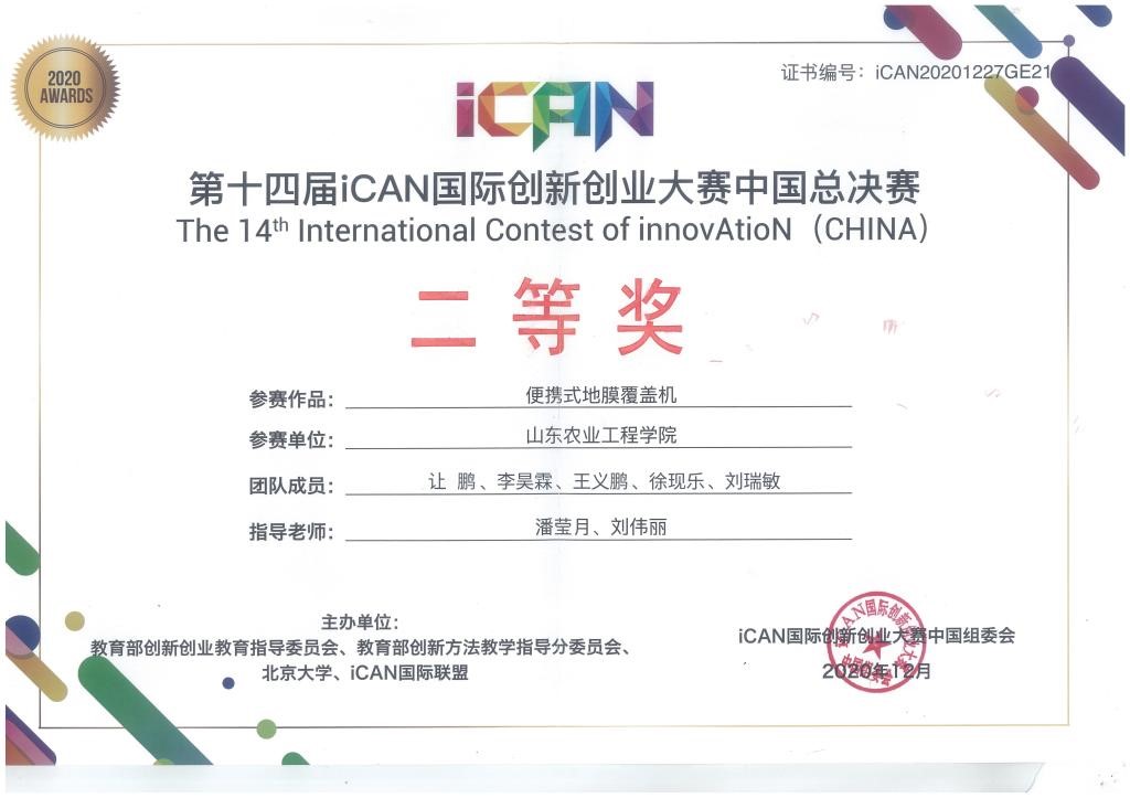 在校领导和机械电子工程学院多位专业教师的大力支持下,指导教师赵志桓、牟向阳、韩镒戎、潘莹月、刘伟丽带领的工程创新团队经历了前期艰苦的项目制作,在浙江余姚参加第十四届iCAN国际创新创业大赛中国总决赛中,参加项目“便携式地膜覆盖机”作品荣获国家级二等奖,“自跟随喷桶机器人”作品荣获国家级三等奖,“智能电动牙刷”作品并荣获国家级三等奖。
