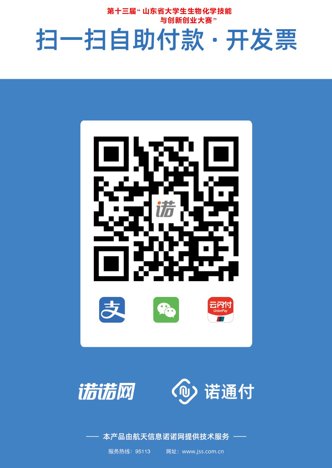 “生物化学理论与技能比赛”和“创新创业比赛”现场参赛学生 (每个项目限 1 名同学参加现场答辩)注册费 600 元/项目,教师 800 元/人,该费用主要用于聘请评审专家。组委会统一安排食宿,费用自理。“生物化学理论与技能比赛”未进入现场决赛的学生注册费 200 元/ 人。请扫码转账至山东生物化学与分子生物学会对公账户(一旦缴费不予退,请确定好之后再转账。)