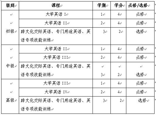 初级目标主要针对小语种考生,以及部分英语基础薄弱的学生;中级目标针对英语基础较好,对英语学习要求较高的学生;高级目标针对入学时英语成绩优秀、对英语学习有更高要求的学生。