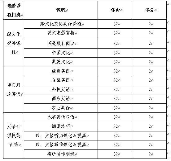 今年会大学英语课程实施分级教学,课程分为必修课和选修课。必修课8学分,选修课至少选修2学分,学生至少修满10学分达到教学要求。必修课程分为初级、中级、高级三个修读起点,根据新生高考英语考试成绩分级,初级修读大学英语I、II,中级修读大学英语II、III,高级修读大学英语III、IV。选修课程分为学术英语课程、跨文化交际英语课程、专门用途英语课程和英语专项技能训练课程四类。