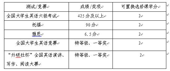 学生获得省级以上学科竞赛奖项,或参加英语等级考试成绩优秀,可置换英语选修课学分。具体参考英语课程学分置换表的相关要求。