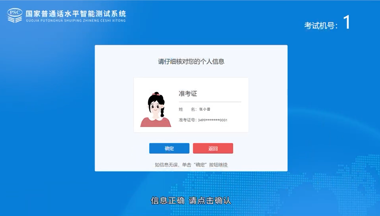人脸识别验证通过后,电脑界面上会显示应试人的个人信息,应试人认真核对,确认无误后点击“确定”按钮进入下一环节。如果信息错误,请告知老师。