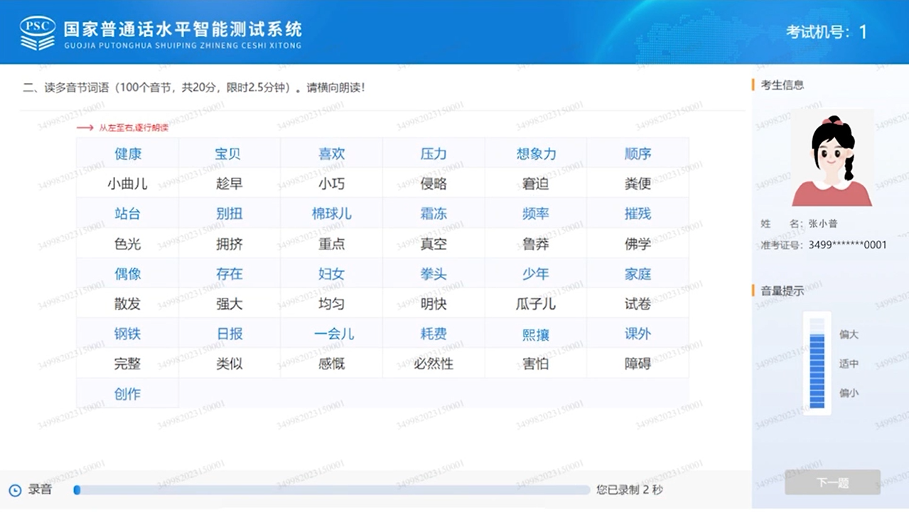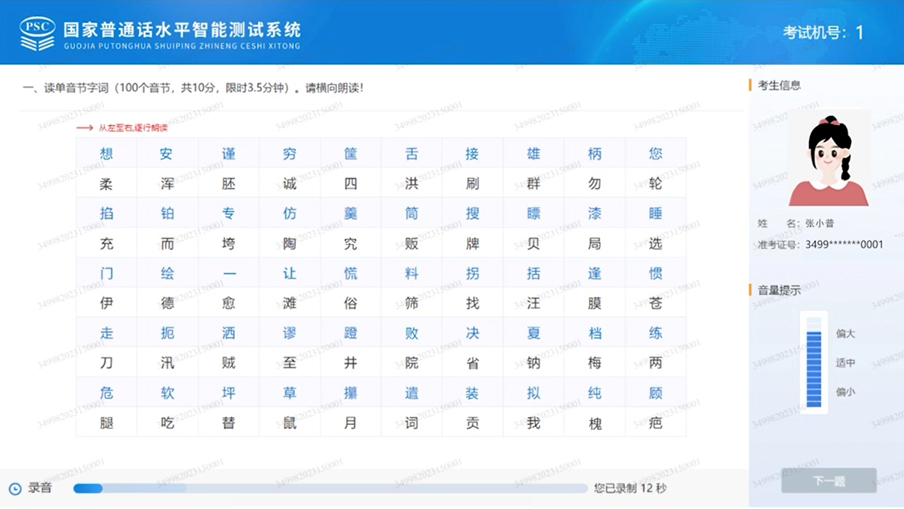 系统进入第一题提示“第一题,读单音节字词,限时3.5分钟,请横向朗读”应试人听到“嘟”声后,朗读试卷内容。
