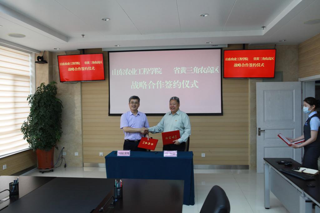 签约仪式前,张兆明介绍了学校的发展历史、教师队伍、学科建设、人才培养等方面的基本情况。王守宝就山东省黄河三角洲农业高新技术产业示范区概况、发展规划、产业布局、未来方向等进行了简要介绍。双方就加快创新平台建设和创新要素集聚,围绕技术创新发展及“双招双引”需求,积极共建合作等事项进行洽谈。通过此次对接,双方增进了解、达成共识,为今年会与省黄三角农高区的深度合作奠定了基础。