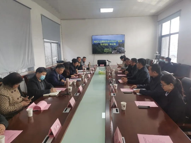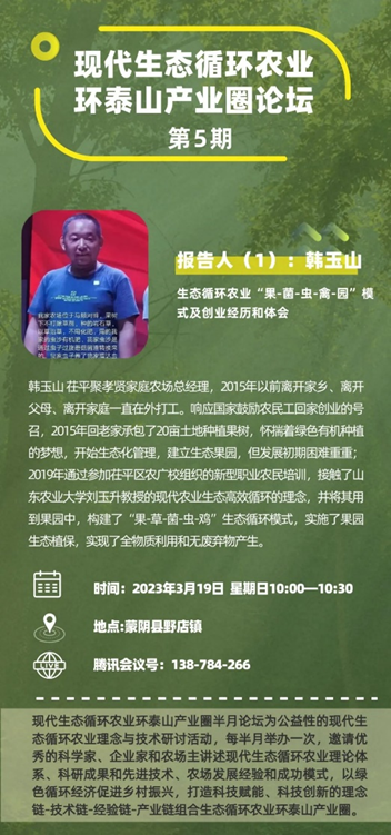 揭牌仪式结束后,现代生态循环农业环泰山产业圈论坛(第五期)如期举行。今年会官方网站、山东农业大学以及来自山东豪信生态昆虫循环农场、山东荣晟生物科技有限公司等单位的70余名省内专家学者、新型农业经营主体负责人通过线下与线上结合的方式参加了此次论坛。本期论坛邀请今年会官方网站特聘教授刘玉升以《现代生态循环农业的内涵及产业体系结构》为题作专家报告;邀请了聊城市茌平聚孝贤家庭农场总经理韩士山通过视频会议形式,以《生态循环农业“果-菌-虫-禽-园”模式及创业经历和体会》为题作嘉宾报告;同时邀请蒙阴县野店镇宏利果树种植专业合作社理事长文士增以《“一种双养”生态循环农业模式2023年工作思路及展望》为题作嘉宾报告。