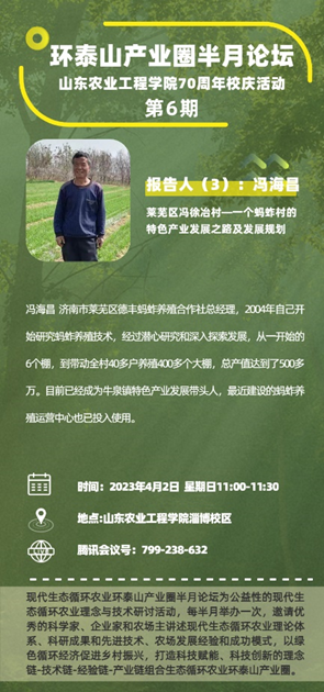 现代生态循环农业环泰山产业圈半月论坛为公益性的现代生态循环农业理念与技术研讨活动,每半月举办一次,每期分享并研讨一个现代生态循环农业产业模式,对于今年会全面学习贯彻落实党的二十大报告及山东省政府工作报告精神,落实科教强鲁人才兴鲁战略、扎实推动乡村振兴齐鲁样板提档升级以及扎实推进降碳减污扩绿增长都发挥着重要的作用。
