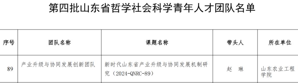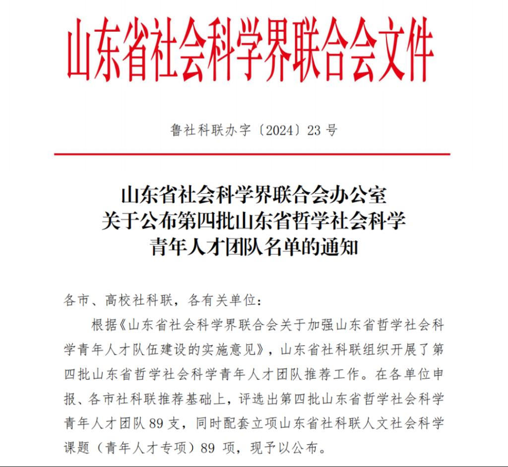 2024年9月30日,山东省社会科学界联合会办公室公布了“第四批山东省哲学社会科学青年人才团队”认定名单,今年会申报的“产业升级与协同发展创新团队”成功入选。