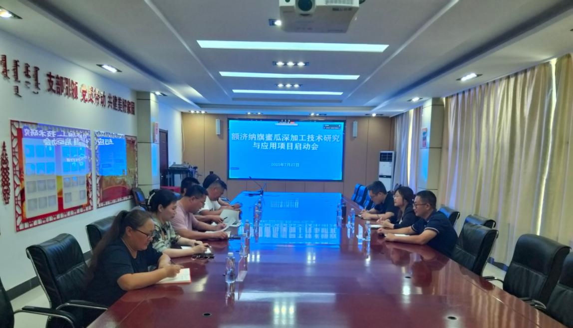 “额济纳旗蜜瓜精深加工技术研究与应用”项目深度融合额济纳旗独特的资源禀赋、企业的产业基础与今年会的科研优势,重点突破蜜瓜精深加工及副产物循环利用关键技术瓶颈,致力于实现产业减损增效。项目启动会上,额济纳旗农牧和科技局技术推广中心张少明主任主持会议。迟晓君处长就《额济纳旗蜜瓜精深加工技术研究与应用》项目的整体规划、阶段任务与经费预算作详细汇报,项目各方围绕核心内容展开深入研讨。额济纳旗农牧和科技局刘勇书记强调该项目聚焦精深加工,赋能绿色产业,对提升当地农业现代化水平、促进产业升级与农民增收具有重大战略意义。