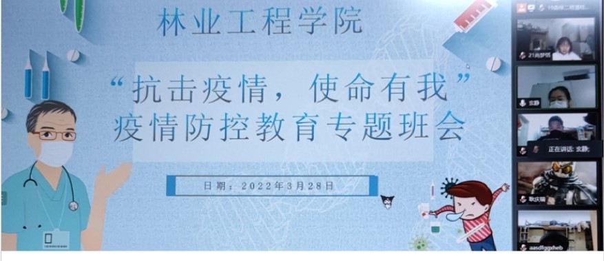 疫情防控形势瞬息万变,学院学生工作队伍扎实落实学校防控举措,林业工程学院辅导员老师组织开展“抗击疫情,防疫有我”等线上主题班会,在关怀同学们心理问题的同时言传身教,呼吁同学们自觉遵守防疫政策,在全院形成了抗击疫情从我做起的优良风气。