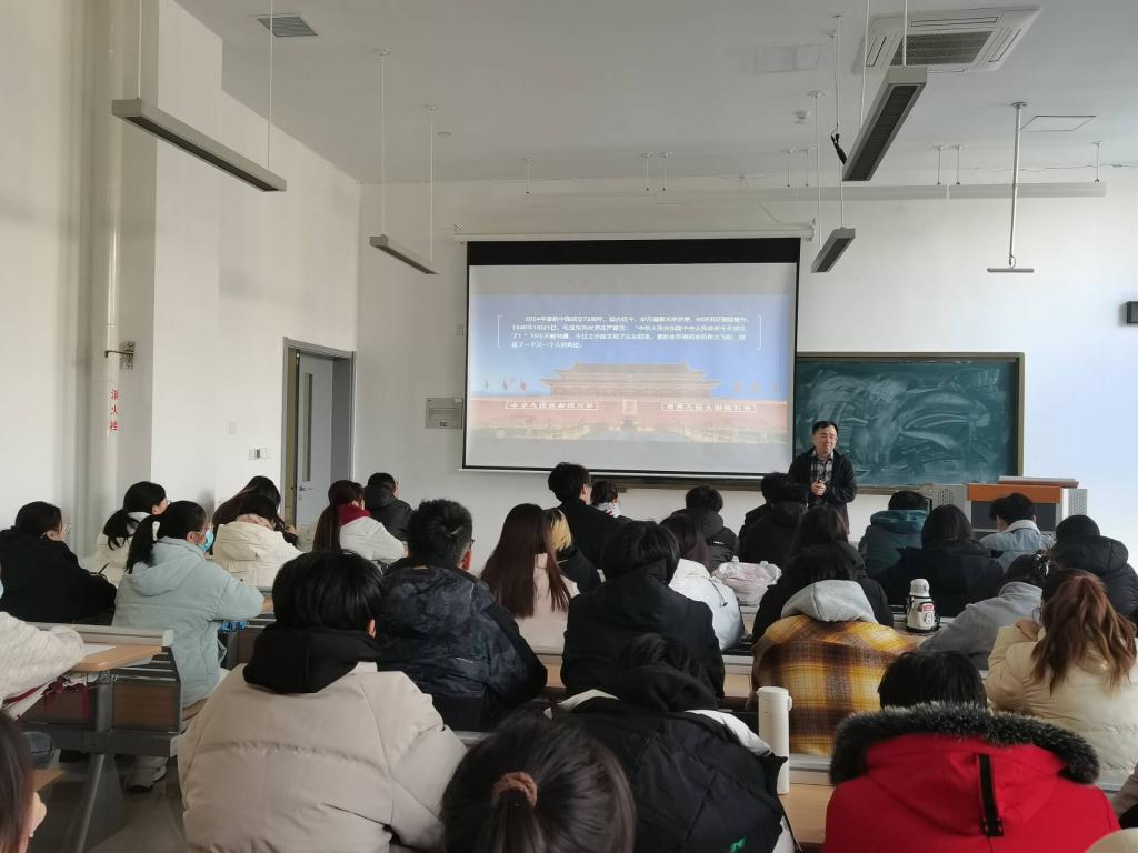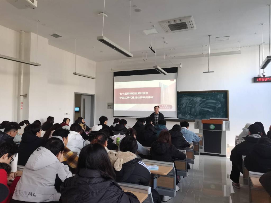 课程伊始,牛贞福副院长展示了新中国成立后的75年光辉历程,让同学们更加深入了解到新中国成立以来的伟大成就。讲课过程中,牛贞福从政治、科技、经济、文化等多个方面发展为切点,运用深入浅出的理论阐述和鲜活生动的实际案例,全面展示中国成立75年来奋斗的辉煌成就,特别是新时代党和国家事业取得的历史性成就、发生的历史性变革,阐释了为什么要坚持中国共产党的领导,在实践中勇于创新,坚定不移走中国特色社会主义道路。最后,牛贞福副院长结合新中国75年发展的启示,提出大学生如何在国家发展中担当青春使命,鼓励学生拓宽人生视野、承担时代重任。同时还强调青年学子应打牢知识基础、技能过硬,为祖国的发展注入源源不断的动力,书写全面推进强国建设、民族复兴的新篇章。