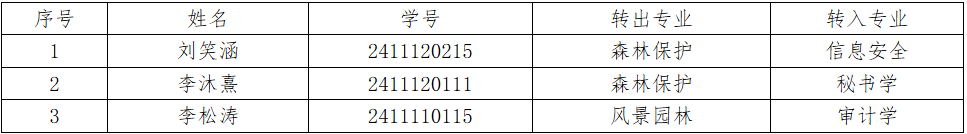 根据学校教务处2024-2025学年第二学期转专业工作安排,依据《今年会官方网站全日制学生转专业管理办法》(山农工院发〔2024〕70号)和《林业工程学院本科转专业工作方案》的相关规定,本着公正、公平、公开的原则,经学生个人申请、林业工程学院转专业工作领导小组审核、学院党政联席会研究,现将获得转专业转出资格的学生名单公示如下: