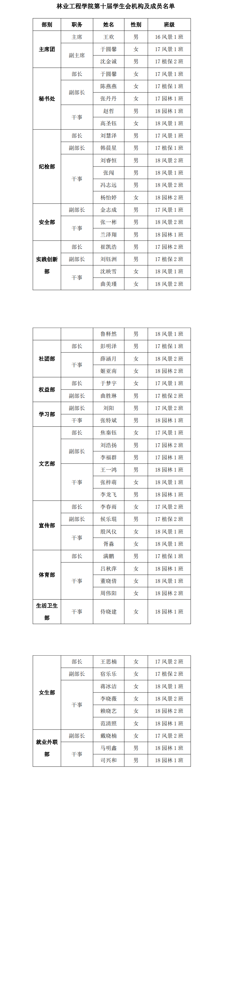 林业工程学院第十届学生会机构及成员名单