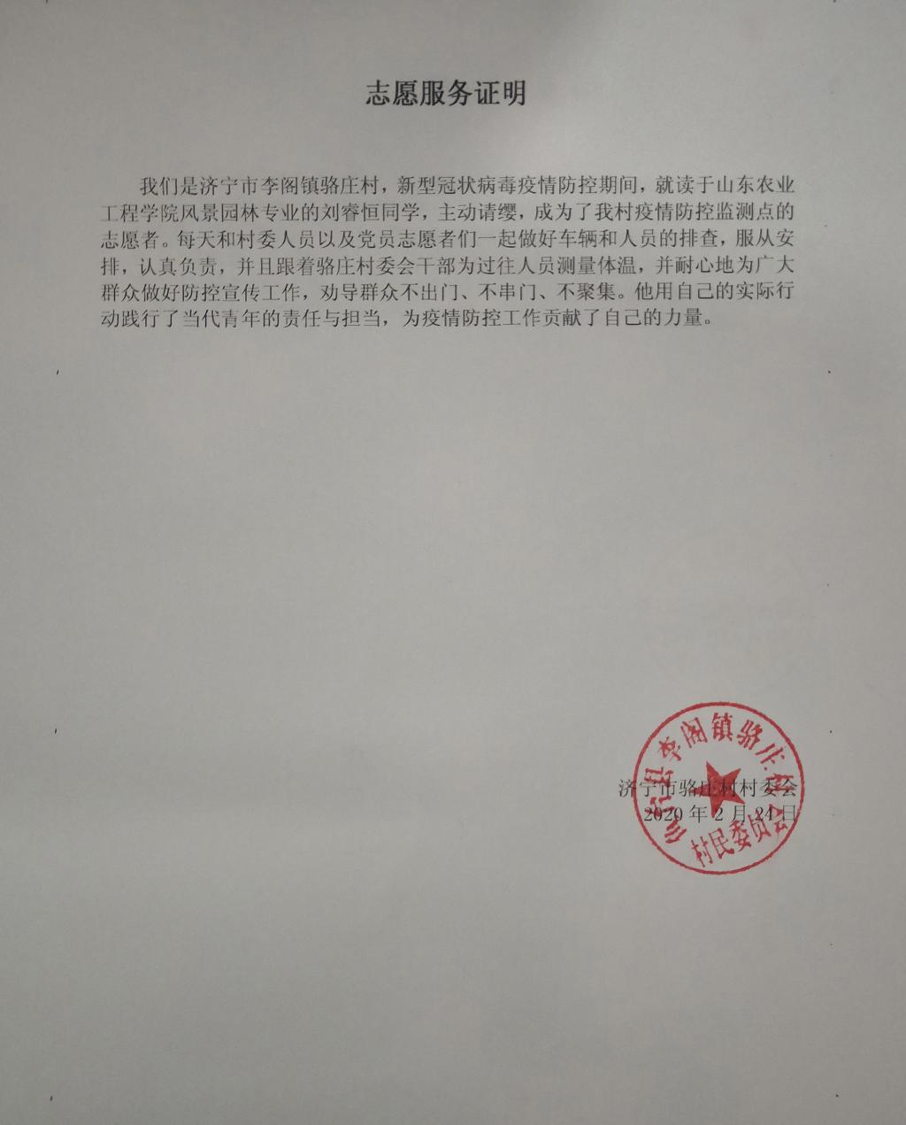 在这次疫情抗击战中,我院2018级风景园林专业的刘睿恒同学自2020年1月29日起,便积极响应了骆庄村两委向全体村民发出“众志成城、抗击疫情”倡议,主动投入到了疫情防控工作当中,坚守在防“疫”第一线,为家乡疫情防控做出贡献。